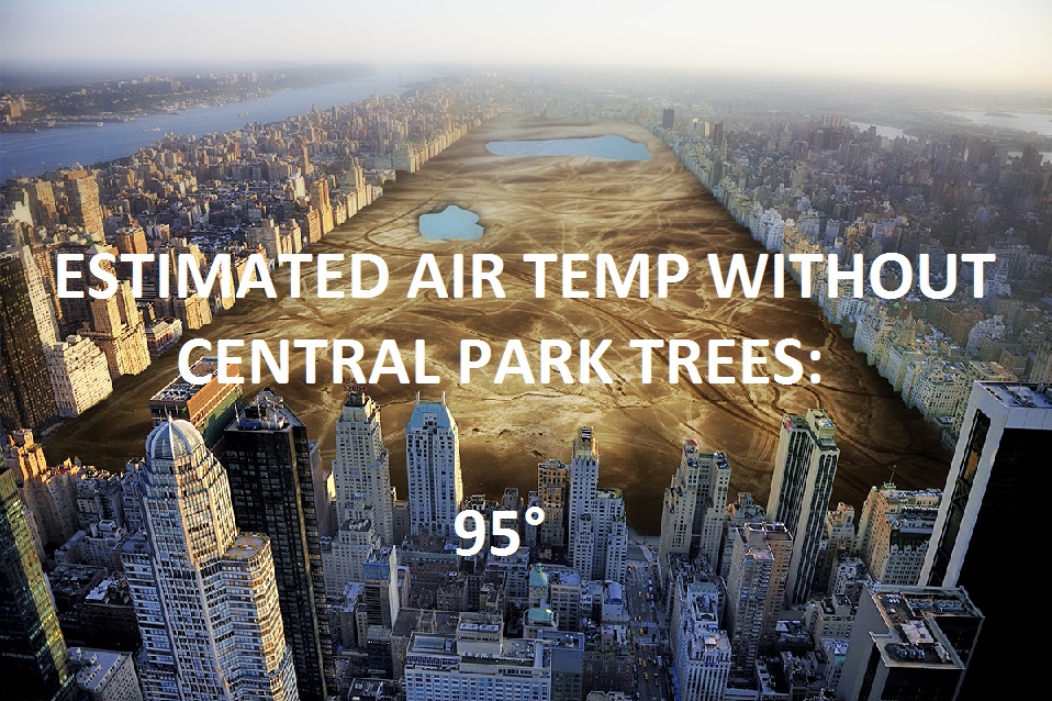 Although it is impossible to predict exactly how hot NYC would become without its largest city park, it is estimated that large parks or tracts of urban trees can cool daytime summer temperatures by 10-12 degrees. Thus, we can assume that New York would be a much warmer city without Central Park's canopy.